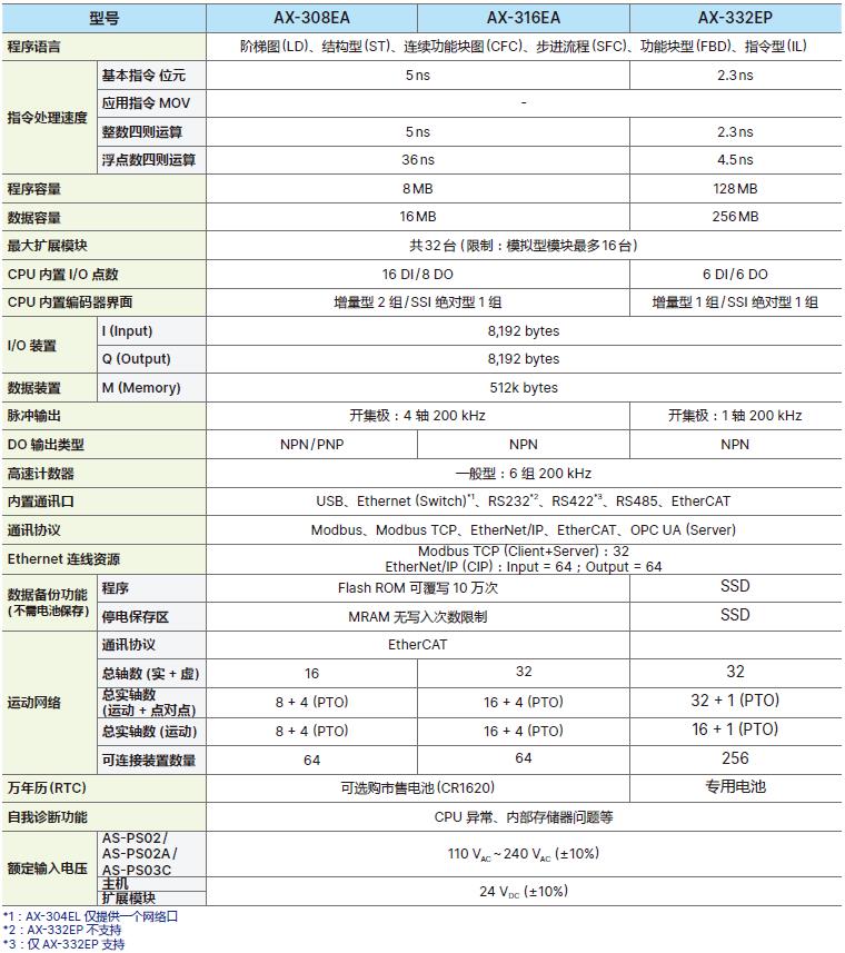 - AX-308E?/?AX-316E?/?AX-332E CPU最高可支持8?/?16?/?32軸EtherCAT (AX-332E 同步時間最快 1ms@32軸)